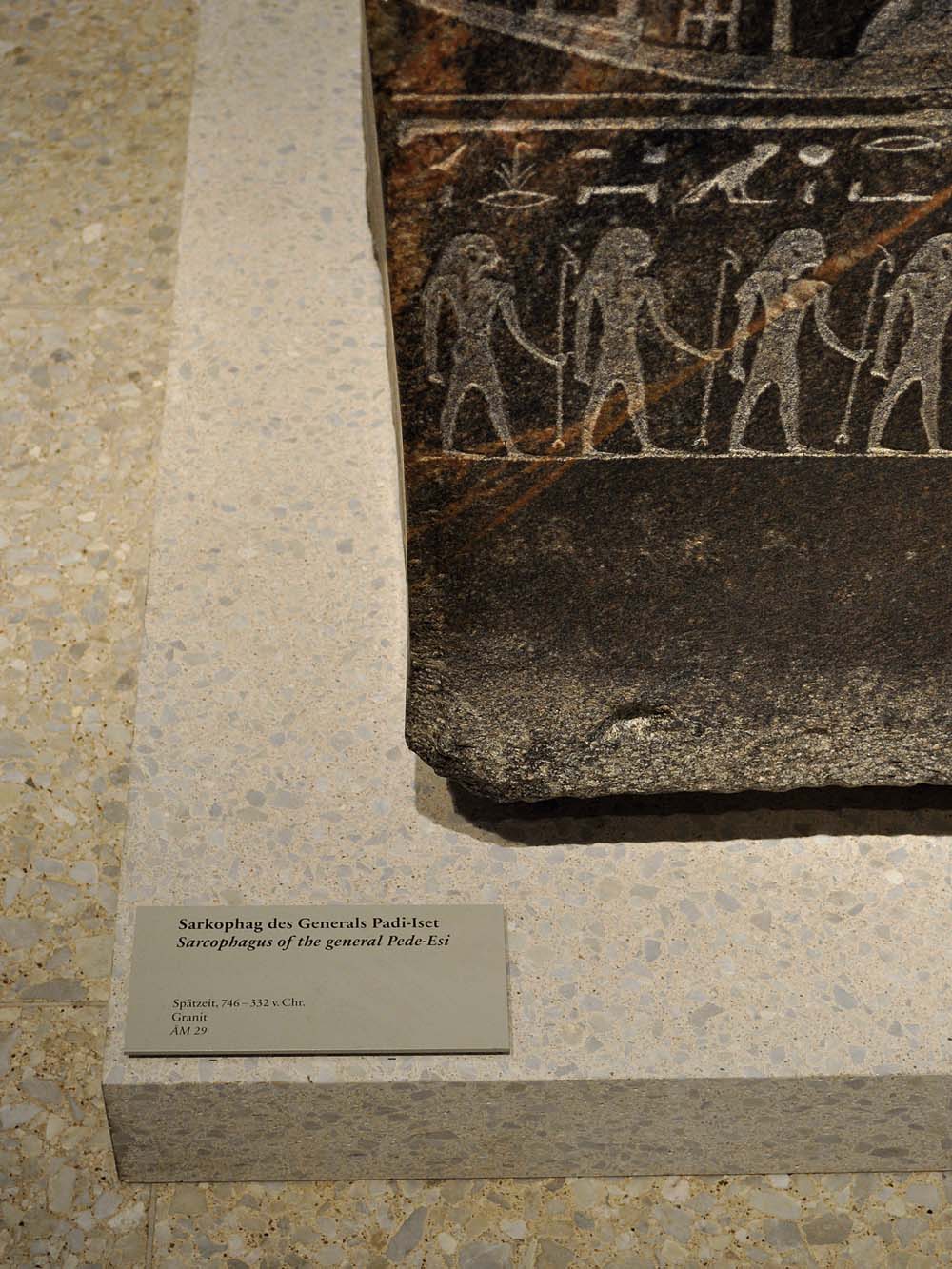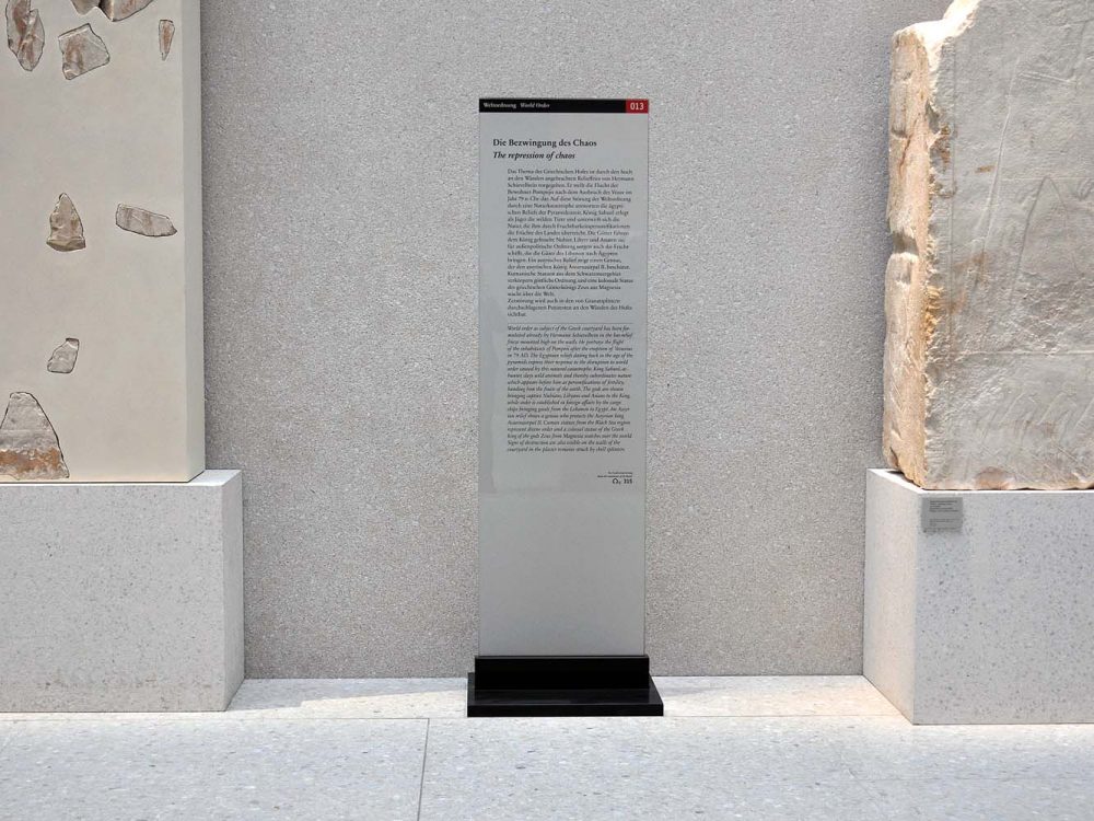 Realisierung der Ausstellungsgrafik für die ständige Ausstellung des Neuen Museums in enger Zusammenarbeit mit den Sammlungen Ägyptisches Museum und Papyrussammlung sowie Museum für Vor- und Frühgeschichte. Umsetzung in einem kleinen Team bei Polyform, Berlin, auf Basis des Entwurfs von Michele de Lucci, Mailand.